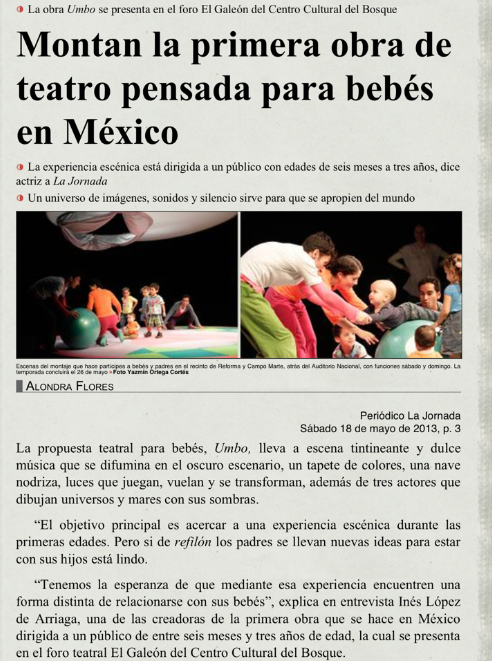Caso 2. Por estos días apareció en el periódico una entrevista a Inés López de Arriaga sobre Umbo, primera obra teatral para bebés en México. Inés (amiga mía hace más de 30 años) es sicoterapeuta, actriz, ex bailarina e integrante de la compañía Teatro Al Vacío. Explica que la obra se dirige a chicos entre seis meses y tres años, para acercarlos a una experiencia sensorial/escénica a través de luces, música suave, sombras. La he visto dos veces: me consta que durante la media hora que dura, los bebés están embebidos por los estímulos que reciben. Y es que esto no es una ocurrencia. Detrás de Umbo hay mucha investigación sobre el desarrollo cognitivo y emocional del bebé, adaptada por Inés y sus colegas a técnicas corporales.