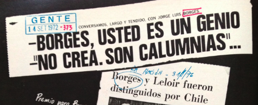 Los editores cuentan cómo decidieron qué incluir. Más que compendiar opiniones o críticas, decidieron «acercar el ídolo a su público» a través de un collage de recortes, fotos, textos y frases trepidantes. Las 212 páginas se dividen en capítulos como «Borges y los que escriben», «Borges y el tango», «Borges y las mujeres». Ahí se encuentran mil y un cosas que yo desconocía, como su árbol genealógico (espada vikinga included), notas de prensa sobre su matrimonio a los 67 años con Elsa Astete, dos sonetos ilustrados por su hermana Norah, el primer cuento que publicó a los 13 años (se puede leer aquí, más abajo, dando doble click a la foto para ampliarla), recortes de periódico de su condecoración en Harvard, fotos de cintas basadas en cuentos suyos… Me siento una adolescente cursi ante la revista que ofrece fotos y anécdotas de su artista favorito: al cerrarla me digo que lo conozco más y sí, también lo siento un poco más mío. O, para que suene mejor, paladeo esta joya para coleccionistas borgeanos.
