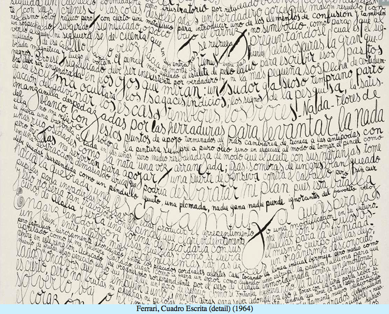 Otros detalles de su relación con la literatura fue su relación con Juan Gelman y Julio Cortázar, además de la publicación, en el 2000, de La bondadosa crueldad, libro de collages y poemas de su autoría que, por desgracia, sólo conozco de referencia, pero que incluye estos versos irónicos: «Si yo supiera pintar […] si Dios en su apuro y turbado por error confuso me hubiera tocado”. El año pasado tuve la Fortuna de ver en el Museo de Arte Latinoamericano de Buenos Aires (el famoso MALBA), la muestra Brailles y Relecturas de la Biblia. Yo no conocía el trabajo de Ferrari pero su propuesta me deslumbró. En estos días mucho se ha hablado sobre el artista, el crítico, el confrontado con el entonces arzobispo Bergoglio y su lamento hacia el nombramiento de éste como papa, el comprometido socialmente. Lamento todo ello, pero no quiero dejar de marcar el acento hacia la pérdida del Ferrari que, además, concibió poesía para tocar.