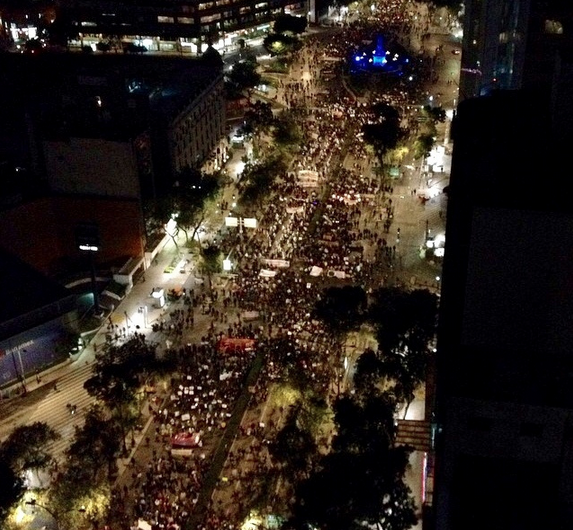 El hartazgo contra la impunidad que tiene al país empapado en sangre y exigiendo justicia por los 43 estudiantes desaparecidos de Ayotzinapa llevó ayer a muchos miles de personas (las cifras van desde 30 hasta 500 mil) a marchar desde tres puntos distintos de la capital hasta llegar al Zócalo. Además hubo manifestaciones en 26 estados de la República y en más de 25 ciudades del extranjero. Es, seguramente, la mayor manifestación organizada en la historia de México. Muchos autores se sumaron a ella con acciones y palabras, y desde Twitter hicieron oír su voz. Al ser éste un blog de libros, aquí va un recuento de los mejores tuits «de autor».