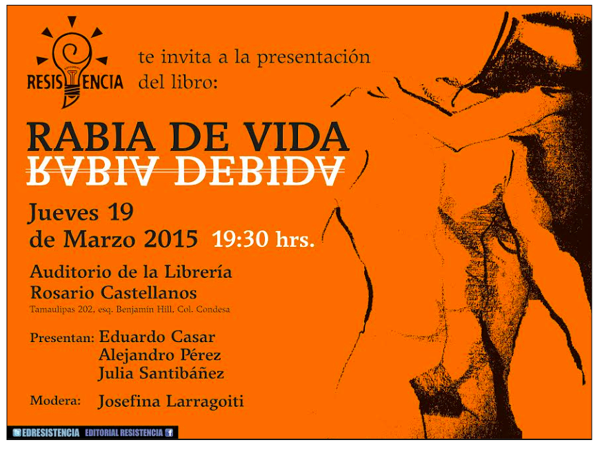 Llega otro #MiércolesDePoesía y uno especial para mí, porque justo mañana presento en sociedad mi libro de poesía erótica Rabia de vida/ Rabia debida. La cita es a las 7:30 p.m. en el auditorio de la librería Rosario Castellanos del Fondo de Cultura Económica, en la Colonia Condesa, Ciudad de México. Lo presentará Eduardo Casar, riquísimo poeta, narrador y conductor del programa de TV de Canal 22, La Dichosa Palabra. Toda la comunidad del blog está invitada, la intención es pasar un buen rato entre versos. Ojalá me puedan acompañar.
