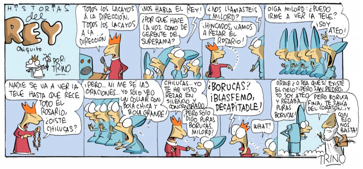 Hace unas semanas les pedí a los seguidores de este blog que me recomendaran a sus humoristas gráficos preferidos, para compartirlos con la comunidad en los lunes «de monos». Tenía tiempo de no revisar el trabajo del mexicano Trino, pero gracias a que Josdamet lo puso sobre la mesa me asomé al blog del ilustrador de Guadalajara y me divertí mucho. Para arrancar la semana aquí va un cartón suyo, a propósito de estos días en los que la religiosidad de unos se desborda y la de otros, que no tenemos, se sienta en la banca a mirar. Según Trino, uno igual puede irse al cielo.