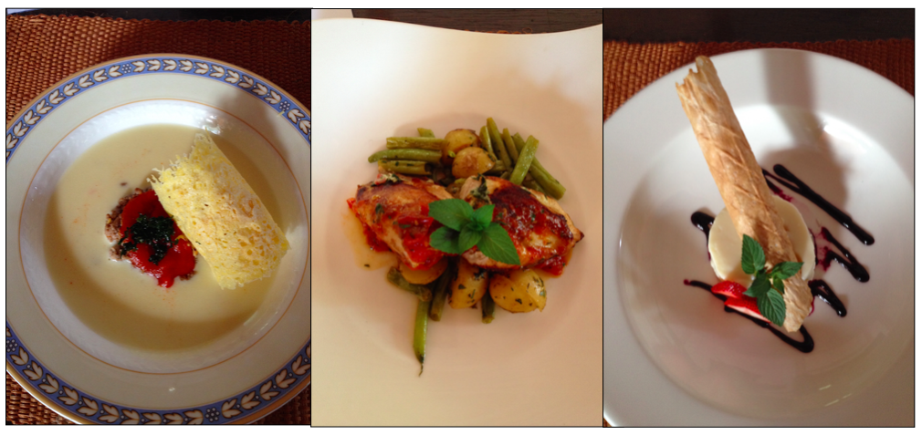 Crema de chile relleno (espectacular), Pollo a la chaya, Panacotta de manjar blanco (leche de coco)