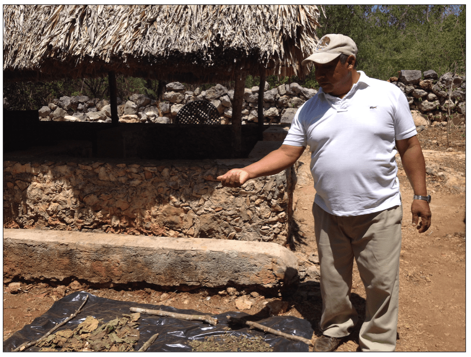 Uno de los ángulos del cuerpo principal de la hacienda.Don Víctor pone a secar las curativas hojas de orégano que cultiva en el Jardín botánico de la hacienda.