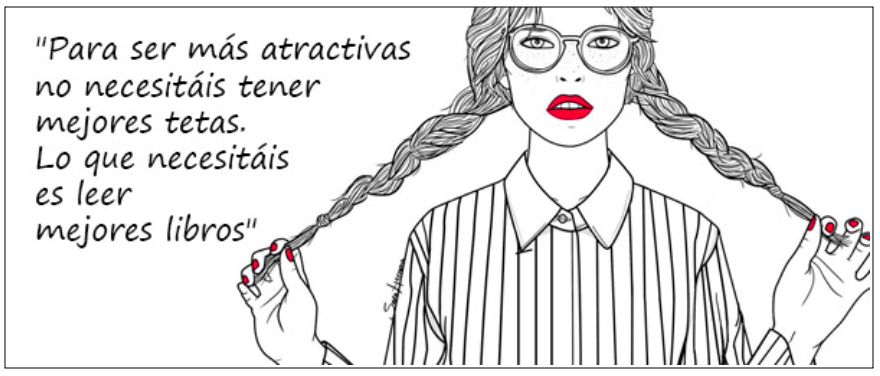 Cada vez más mujeres progres, profesionistas y profesionales independientes, llevan puesta la quincena. Ropa, zapatos y accesorios, maquillaje, joyas, cremas, tratamientos y, claro, las necesarias cirugías estéticas. Me regocija, es el mejor esteitment de que realmente hemos aprendido, de que ya nos liberamos del yugo servil «agradarás a tu prójimo sobre todas las cosas», propio de nuestro sexo durante siglos. ¿Qué es aquella aspiración de la anticuada Sor Juana de «poner bellezas en mi entendimiento/ y no mi entendimiento en las bellezas»? No, señoras mías. Desde la monja jerónima hasta la ilustradora española Sara Herranz (quien perpetró esta ilustración malévola del #LunesDeMonos), esa caterva de machorras, insatisfechas y feministas que quieren ser atractivas por su conversación y sus lecturas, no por sus implantes, ha hecho daño (no mucho, es cierto). Así que, lo dicho: nosotras a seguir con el mandato de los Padres de cerrar la boca y abrir las piernas. Nada más, pero nada menos.