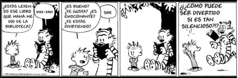 Confieso que no conocía mayormente la tira de Calvin y Hobbes. Apenas había visto un par de ellas, pero desde que Fabiola y Borgeano me sugirieron aquí incluirla en los #LunesDeHumor, me puse a buscarla. Tiene humor, ironía, sarcasmo. Me encanta. Aquí dejo este botón de muestra, para darle un poco de buen vibra al lunes. Y de paso respondo la pregunta existencial de Calvin: leer es un silencio bien poblado de voces. De ecos.
