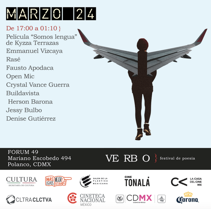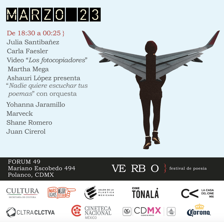 En el marco del Festival Verbo, de oscuras intenciones y mejores propósitos de sacar los versos de la página impresa, hoy varios colegas y yo vamos a perpetrar un numerito escénico. Aquí arriba está el programa: a las 6:30 pm abro con poesía digital interactiva y en el cartel, de lujo, están Carla Faesler, Ashauri López y Juan Cirerol, entre otros.