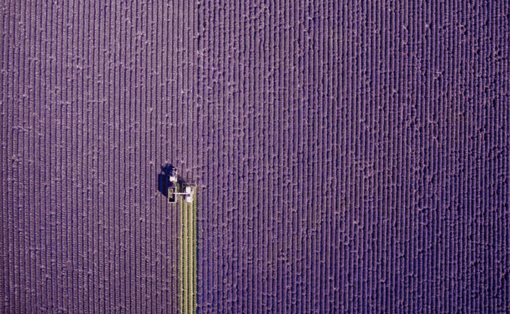 Descripción: Durante el verano, un tractor deja un surco amarillo en un campo de lavanda en Provenza.