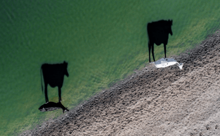 Descripción: Mientras dos vacas toman agua, el sol proyecta sus sombras en el río.