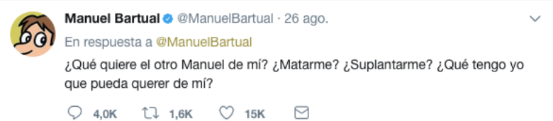 Manuel Bartual, de 38 años, estaba de vacaciones y concibió una micronovela de suspenso que contaría en Twitter, ilustrándola con fotos y videos del celular. La pensó, hizo una escaleta y luego la ejecutó con pocas variantes sobre su idea inicial: las novedades vinieron de atender algunos de los miles de comentarios que generó el hilo narrativo, que se convirtió en Trending Topic (algunos tuits recibieron más de 40 mil likes). Nunca se imaginó que tanta gente se interesaría por el tema, de tintes paranormales: en unos días Bartual pasó de 16 mil seguidores a alrededor de 400 mil, entre los cuales estuvieron Gerard Piqué e Iker Casillas y hasta la policía de su país. Algunos que siguieron al escritor le dieron unfollow cuando descubrieron que se trataba de un “engaño”, así que hoy tiene 370 mil.