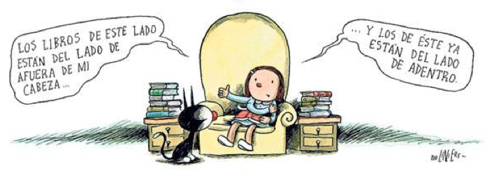 Tal cual en mi caso: muchos, muchísimos libros están afuera, pero algunos ya se integraron a mi cabeza. A esta tira del genial Liniers sólo añado que me llaman la atención los de afuera pero cómo quiero los que están dentro, los que ya forman parte de mi hígado, de mis dientes, de mi pelo.